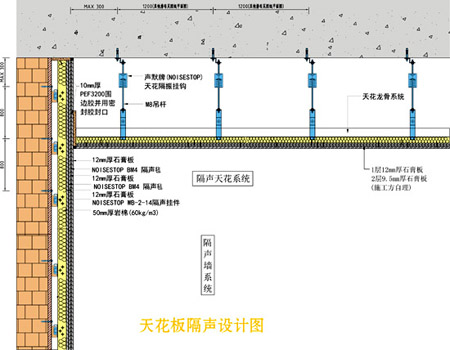 1. 天花板隔聲設(shè)計(jì) 從影院上部結(jié)構(gòu)傳來的噪音,主要是通過樓板傳遞。比如上部有超市、溜冰場(chǎng)或健身房時(shí),天花板的隔聲減振處理就尤為重要。另外有些影廳因?yàn)榻Y(jié)構(gòu)設(shè)計(jì)原因,采用的是大跨度輕質(zhì)屋頂,這就造成了在下雨天會(huì)有較大的雨聲。通常的解決辦法即在觀眾廳的吸聲天花板之上增加一層隔音吊頂。 隔音吊頂主要由結(jié)構(gòu)承載層和隔音吊件、以及隔音棉加石膏板構(gòu)成。承載層將隔聲吊頂和建筑原頂(原結(jié)構(gòu))連接起來,而隔音吊件則阻斷了建筑原頂(原結(jié)構(gòu))中的噪聲向廳內(nèi)的傳遞。見圖