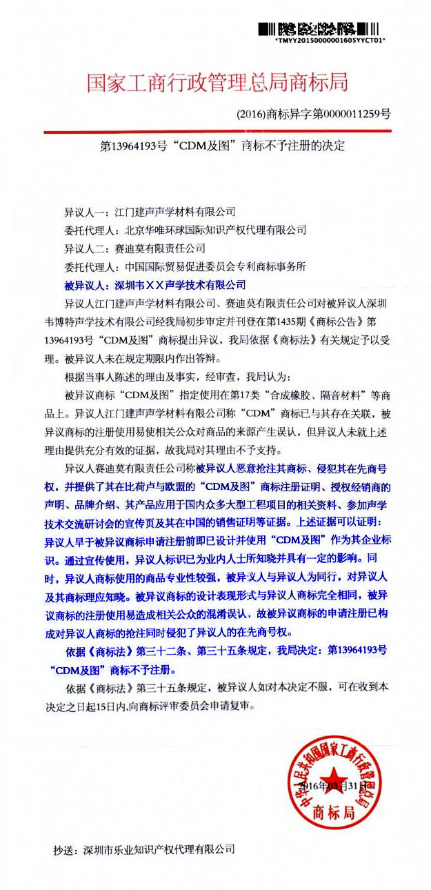 針對其它公司惡意申請CDM商標(biāo),工商局不予注冊通知