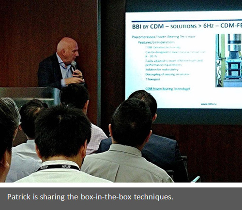 香港 2018年10月29日 CDM CEO Patrick Carels has given a technical presentation to a mixed group of professionals in building constructions at ARUP. He discussed about the advanced technology in Building Base Isolation (BBI) and High-Performance Floating Floors (HPFF). In his presentation he provided an overview of different techniques and the latest developments in controlling and mitigating noise and vibration which can be widely applied in building constructions. Under the rapid growth in acoustic technology, noise and vibration is mitigated more effectively in buildings such as elevators, swimming pools and spas, gym and fitness spaces.