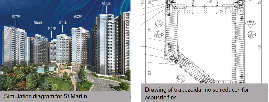 As St Martin is located next to the busy Tolo Highway, some of the flats are unadvoidably affected by traffic noises. Noises is mitigated by applying Acoustic Windows (Baffle Type), Micro-perforated Absorber, Enhanced Acoustic Balcony and modified acoustic fins.