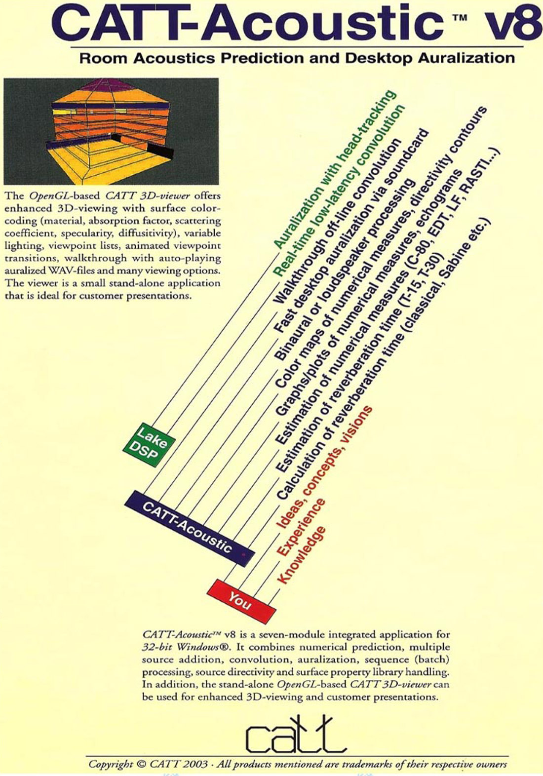 The OpenGL-based CATT 3D-viewer offers enhanced 3D-viewing with surface color-ciding(material,absorption factor,scattering coefficient,specularity,diffusitivity),variablelighting,viewpoint lists,animated viewpoint transitions,walkthrough with auto-playing auralized WAV-files and many viewing options.