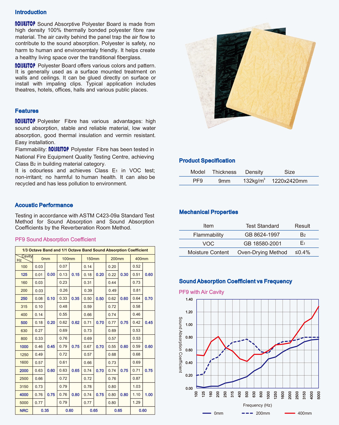 Sound Absorptive Polyester Board is made from high density 100% thermally bonded polyester fibre raw material. The air cavity behind the panel trap the air flow to contribute to the sound absorption. Polyester is safety, no harm to human and environemtaly friendly. It helps create a healthy living space over the tranditional fiberglass.