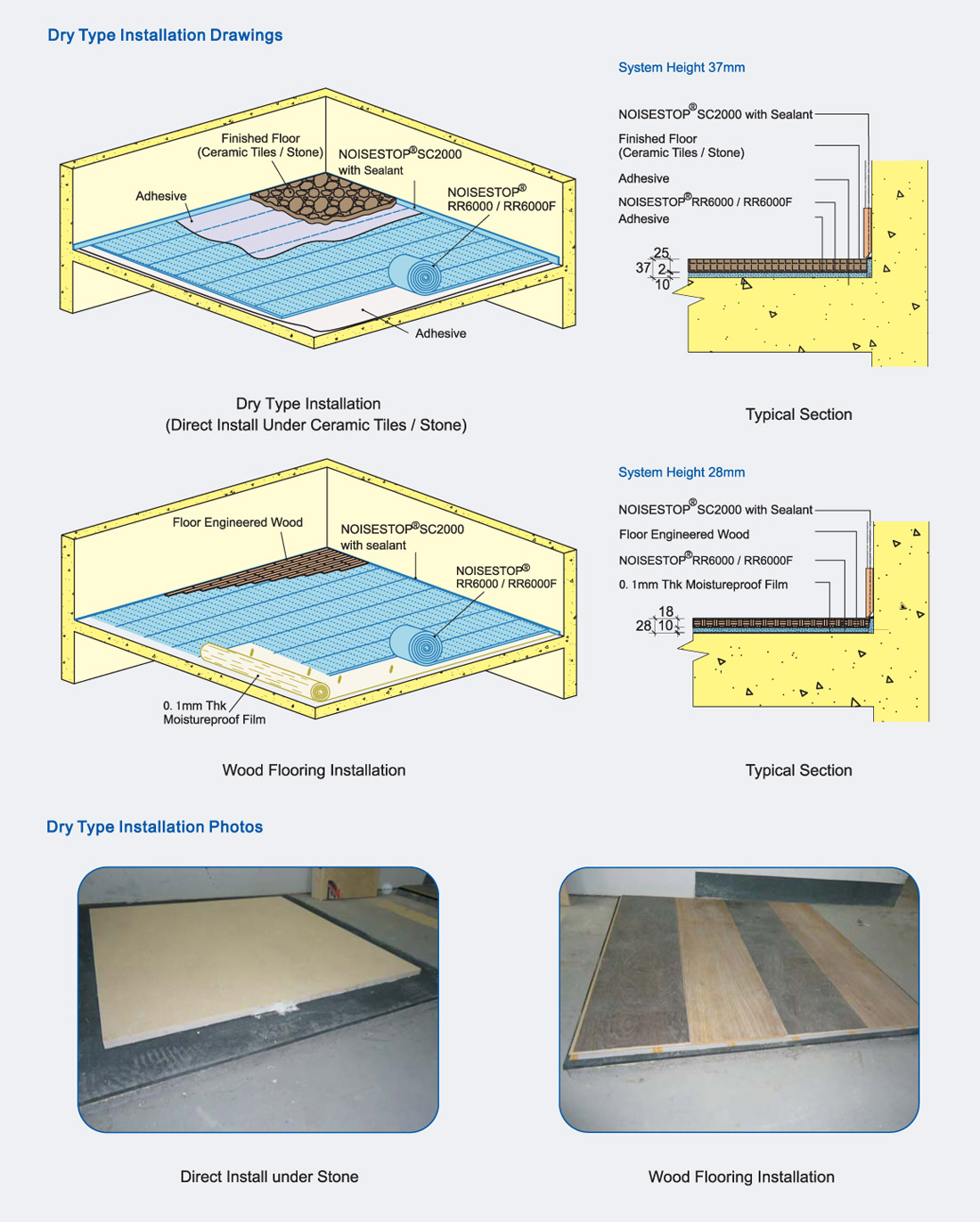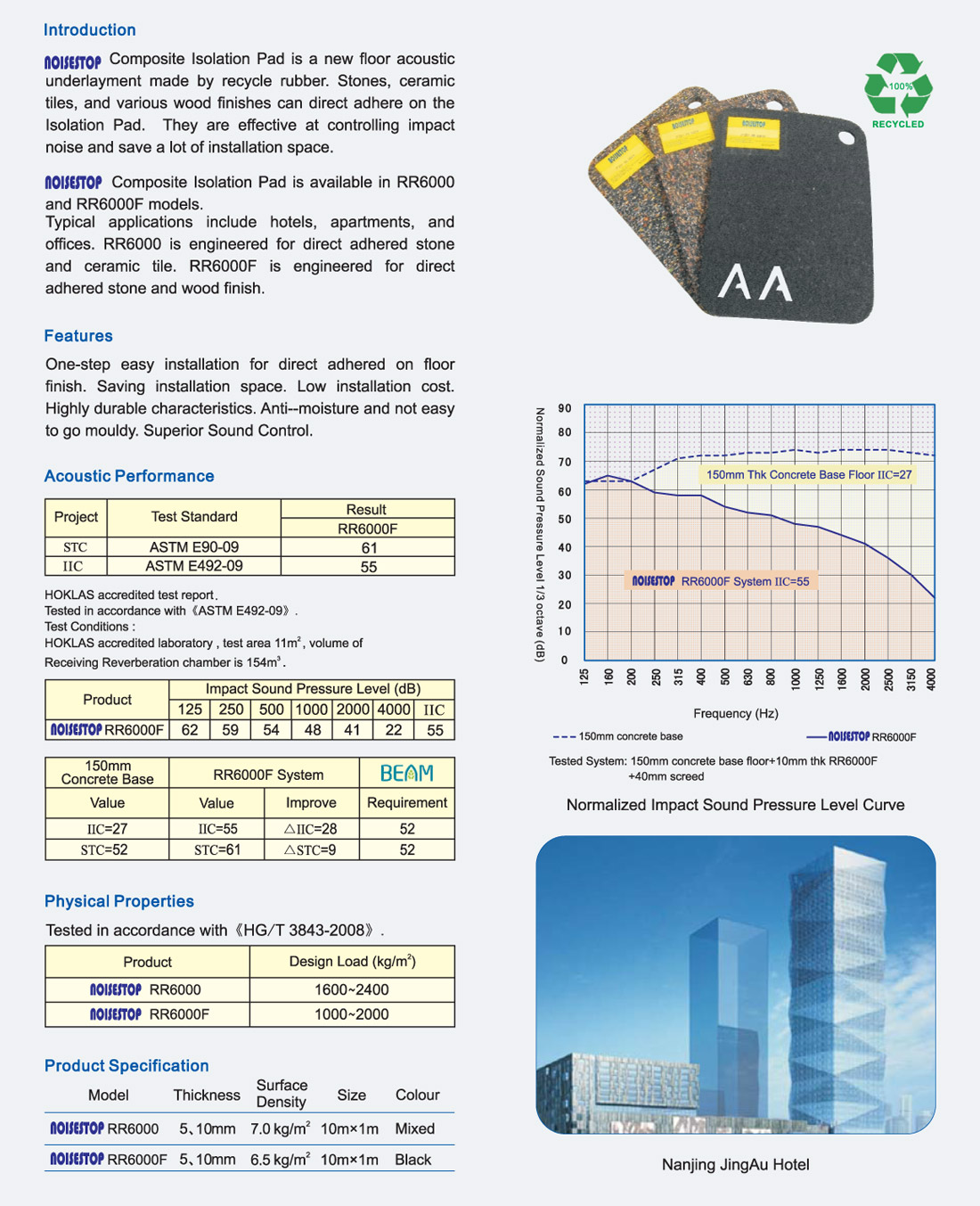 NOISESTOP® RR6000 and RR6000F is a new model Acoustic Floor Underlay made of composite rubber. It can be installed directly under the finished floor and provide excellent sound insulation.