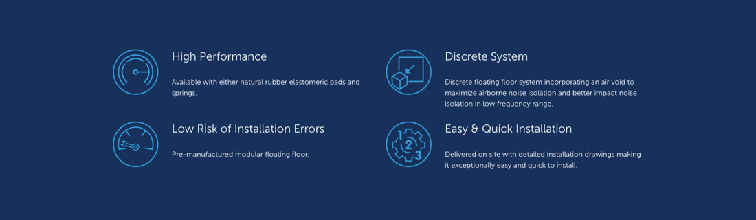 The CDM Stravitec elastomeric bearings or springs ensure this high-performance floating floor system provides excellent structure-borne and airborne noise isolation.