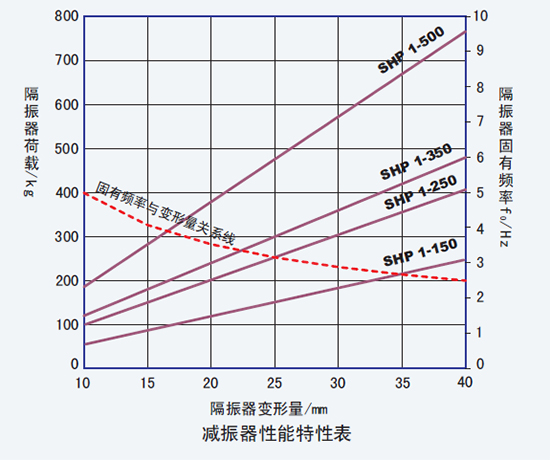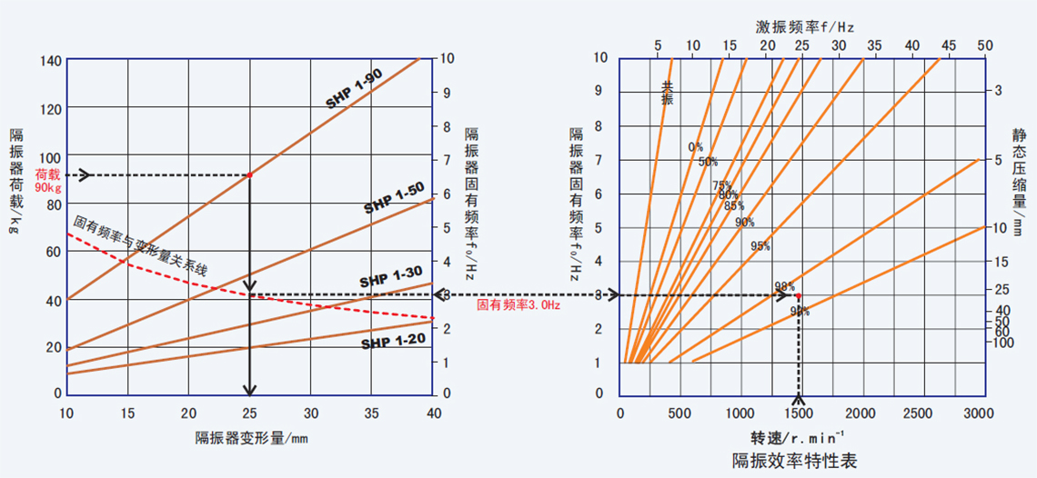 產品選型(舉例說明) 一臺風機設備的總重量360千克(運行重量),設備的轉速為1440轉/分鐘,設備的支點為四個。 根據以上資料進行產品選型: 1、計算每個支點受重為360 4=90千克。 2、由“減振器性能特性表”可得出,當選擇用SHP 1-90,隔振器變形量為25毫米,國有頻率為30.赫茲。 3、然后從“隔振效率特性表”可查得,隔振效率在98%-99%之間。 |