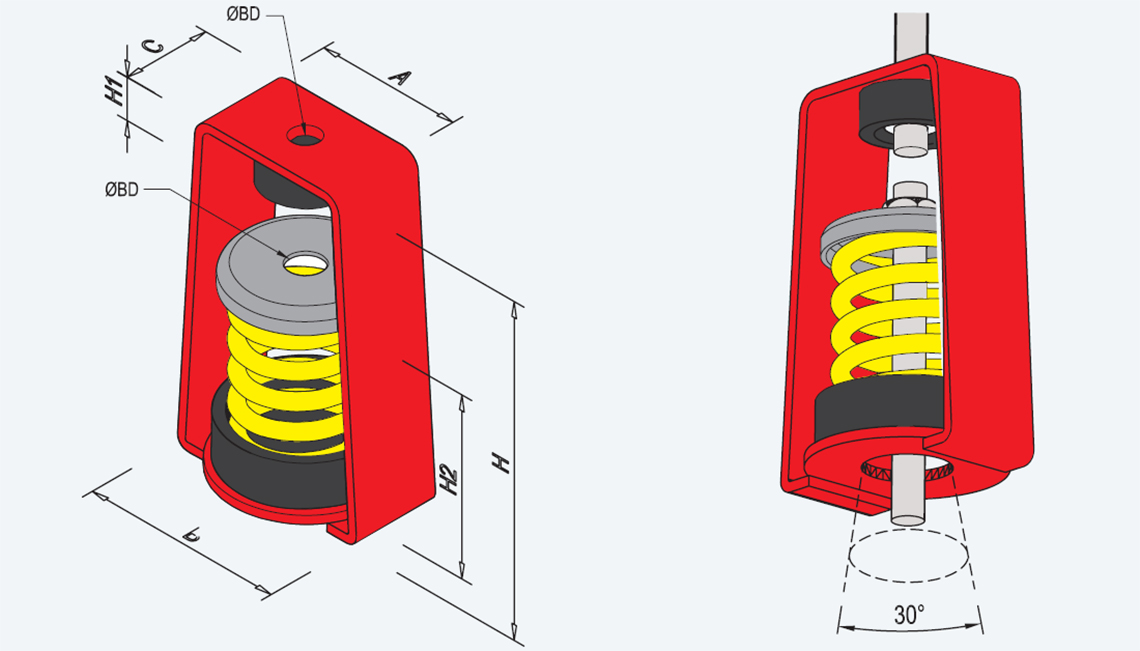 外殼吊桿孔采用大孔設計,提供吊桿在額定荷載下允許任何方向最大以30度夾角于底部回旋,而不會觸碰到吊架底部。減振彈簧3毫米阻尼隔振墊片和阻尼隔振墊復合使用,能有效處理高、低頻的振動和結構噪聲傳播。