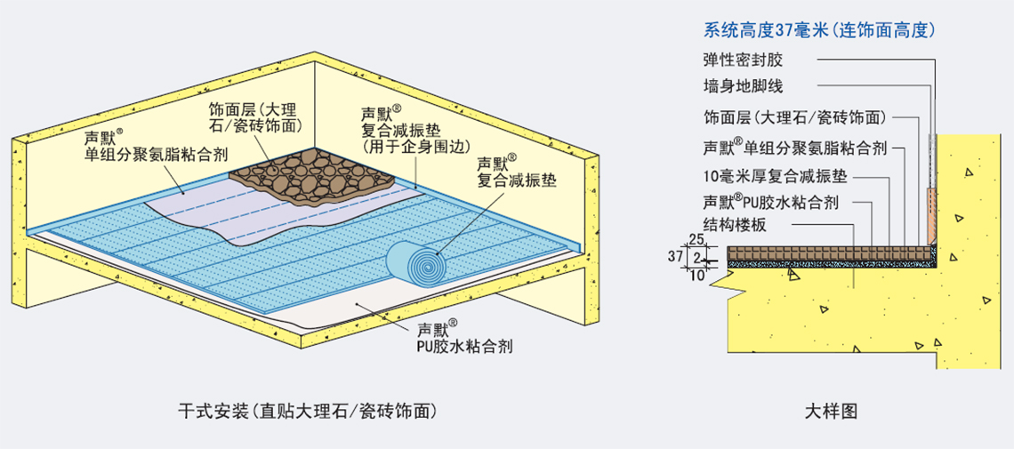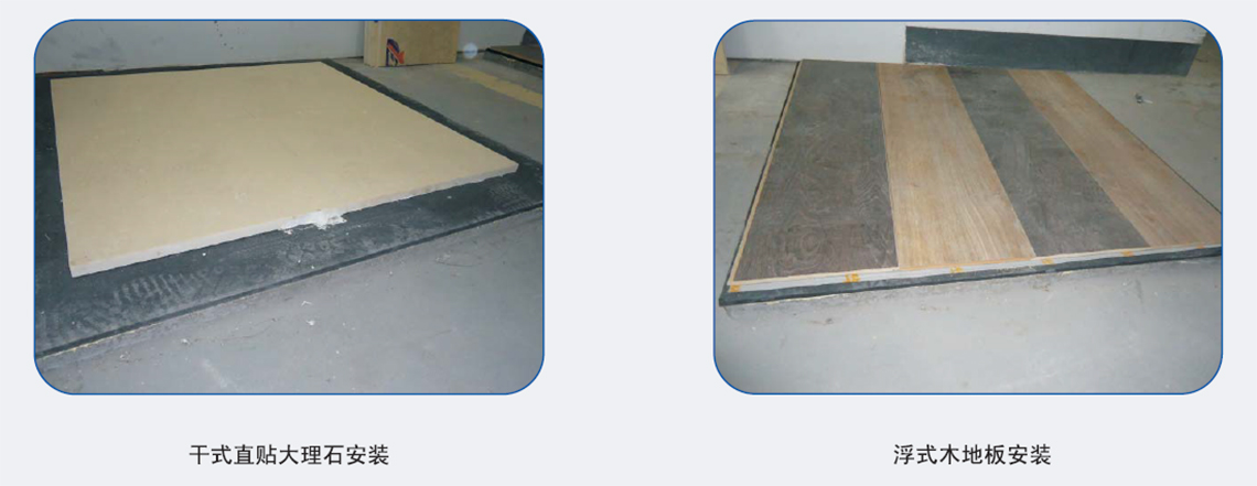 安裝簡易可直接實貼于減震墊上,節省安裝空間,降低整體安裝施工成本;形態穩定,具有優秀抗老化性能;防潮不易發霉;隔聲減振性能優越,用途廣泛。