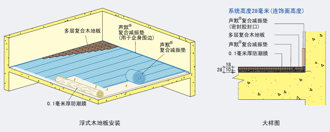 聲默復合減震墊是一種由橡膠顆粒,橡膠泡棉,結合聚氨酯粘合制成的新型產品。大理石、各種木制地板魚各種復合地板可通過粘合劑直接貼在復合減振墊上,不但能節省較大的安裝空間,而且能達到隔音減振的效果。