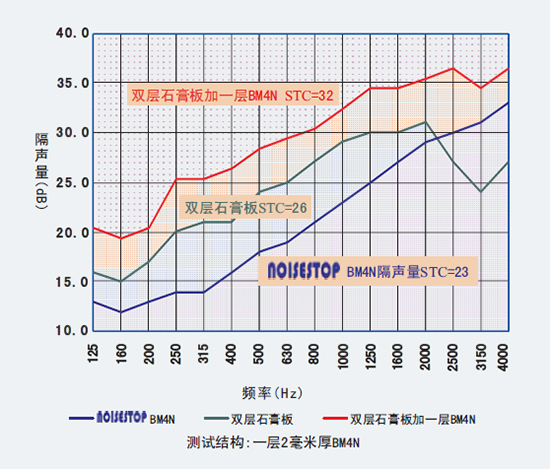 一般提高墻體和天花的隔聲量的方法是:增加結構的面密度,當結構面密度增大一倍時,隔聲量相對應提高6dB。一般方法以增加結構厚度犧牲使用空間的來達到提高隔聲量的目的。而使用錯位頻譜相移原理BM4N既能增加面密度,又能節省安裝空間。